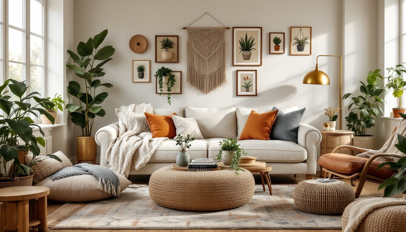 Wall space deserves attention. A gallery wall mixing frames (wood, rattan, unfinished) with macramé and woven hangings feels curated rather than random. Hang pieces at varying heights and spacing, perfection is the enemy of boho. Plants should cluster in corners and on side tables, creating vertical greenery without overwhelming the floor plan.